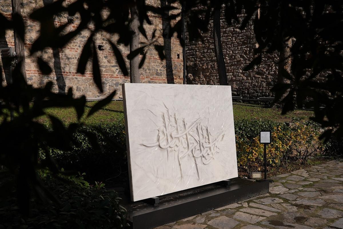 “Libas” başlıklı mermer sürece eser, Bakara Müddeti’nin 187. ayetinde geçen “Onlar sizin için bir örtüdür, siz de onlar için bir örtüsünüz.” ifadesinden hareketle, hattat Seyit Ahmet Depeler tarafından celi sülüs istif ile tasarlandı.