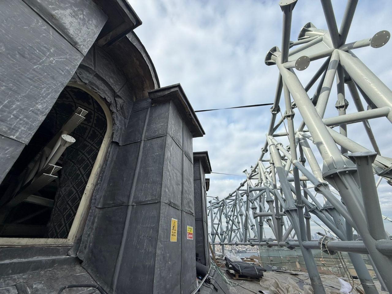 Kültür ve Turizm Bakanlığı’ndan yapılan açıklamaya nazaran; Ayasofya-i Kebir Mescidi’nde yürütülen onarım çalışmaları kapsamında, Koruma Bölge Kurulu kararlarıyla onaylanan projeler doğrultusunda süreksiz çelik çatı imalatları sürüyor. İmal süreci devam eden iç yer çelik platformu ile kubbe üzerindeki süreksiz çelik üst örtü, kubbe pencerelerinden geçecek çelik kirişler vasıtasıyla birbirine bağlanacak. Bu ilişki için Koruma Bölge Kurulu kararı ile kubbelerde bulunan ve özgün olmadığı tespit edilen mermer pencerelerin itinalı söküm süreçlerine başlandı.