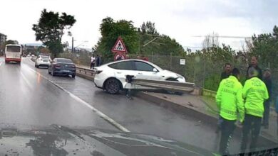 Eskişehir'de ıslak yerde denetimden çıkan Tesla marka araç, bariyere saplandı. Bariyer aracın içinden geçerek başka noktasından çıktı.