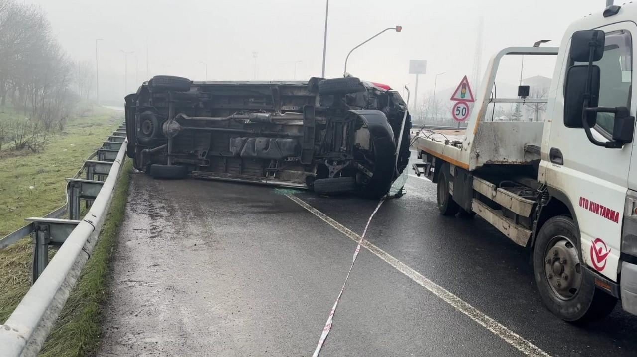 Düzce’de sabah saatlerinde kuzey etraf yolunda kaza meydana geldi. C.T. yönetimindeki özel bir hastaneye ilişkin ambulans ağır sis nedeniyle şoförünün direksiyon denetimini kaybetmesi sonucu bariyerlere çarparak devrildi.