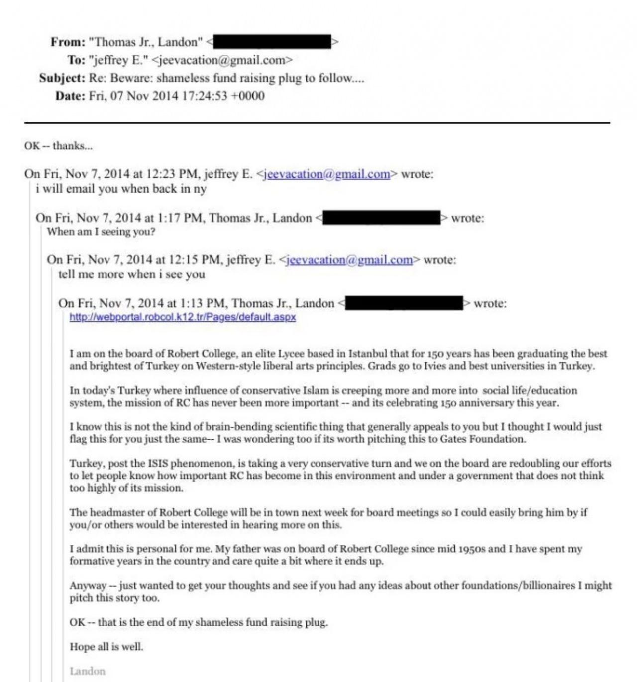 Sızan dokümanlarda, Robert Kolej Yönetim Kurulu Üyesi Landon Thomas Jr.’ın, sapkın ağın merkezindeki Jeffrey Epstein’a Türkiye’deki dindarlaşmadan şikayet ettiği görülüyor. Thomas, mektubunda Türkiye’deki İslami pahaların toplumsal hayata ve eğitime yansımasını “sinsi bir ilerleme” olarak nitelendiriyor.