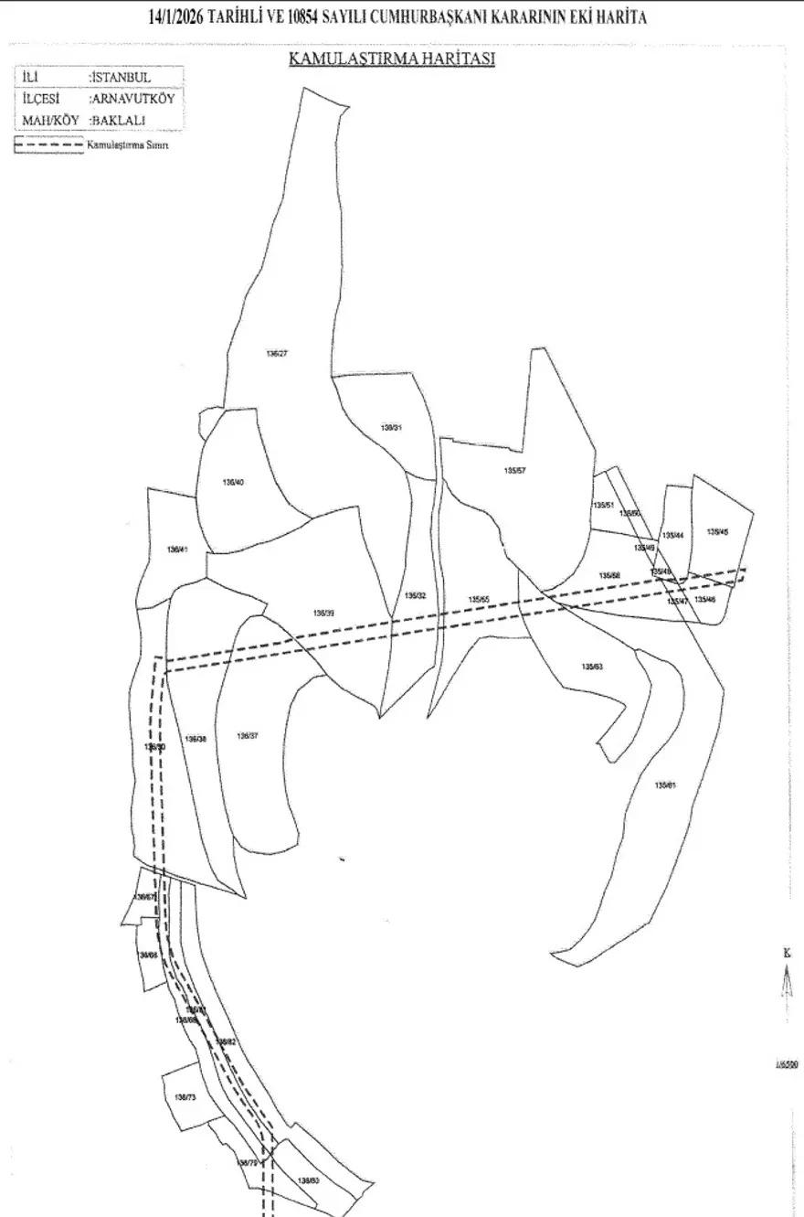 ‘İstanbul İli, Arnavutköy İlçesi, Baklalı Mahallesi sonları içerisinde bulunan ve ekli haritada hudutları gösterilen alanda yer alan özel mülkiyete mevzu taşınmazların, “100.000 Toplumsal Konut Projesi” kapsamında kelam konusu mahallede imali gerçekleştirilen konutlara doğal gaz arzının sağlanması hedefiyle Toplu Konut Yönetimi Başkanlığı tarafından çabuk kamulaştırılmasına, 2942 sayılı Kamulaştırma Kanununun 27 nci hususu yeterince karar verilmiştir.’