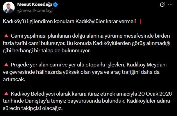 Kararın ardından Kadıköy Belediye Başkanı Mesut Kösedağı’ndan dikkat çeken bir açıklama geldi. Kösedağı, Kadıköy’ü ilgilendiren mevzularda Kadıköylülerin kelam sahibi olması gerektiğini vurgulayarak, cami yapılması planlanan dolgu alanına yürüme arasında birden fazla tarihî caminin bulunduğunu hatırlattı.