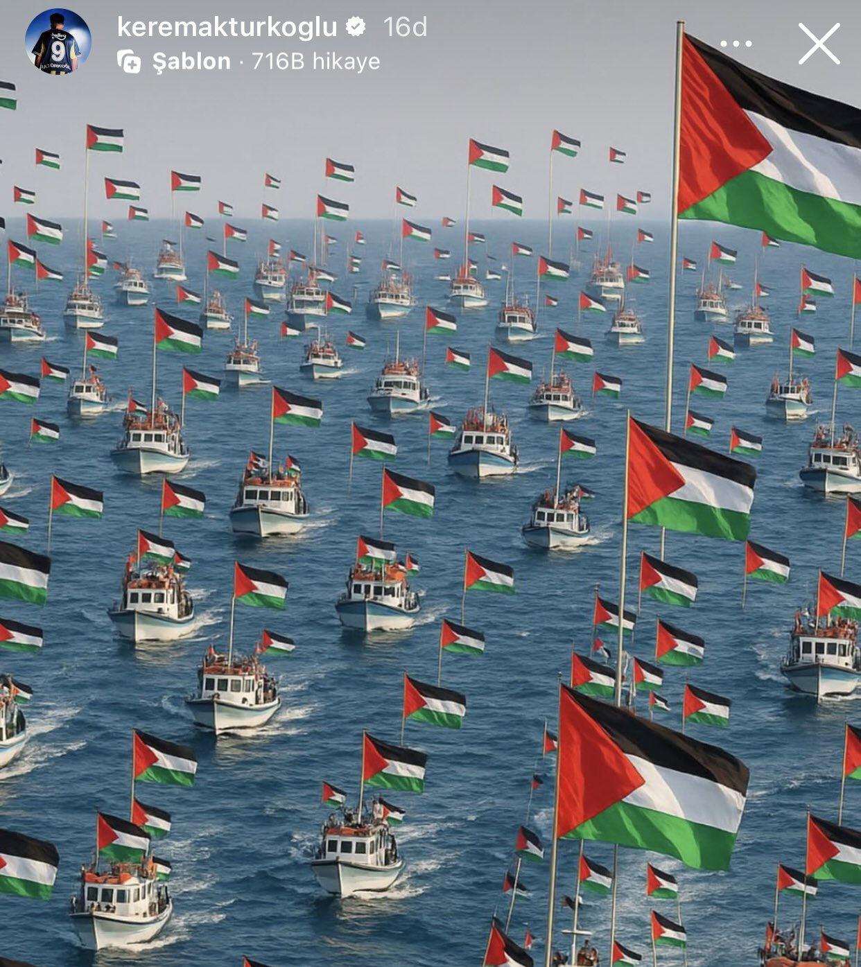 Kerem Aktürkoğlu Instagram hesabından, Global Sumud Filosuna ithaf edilen bir görseli paylaşarak Gazze yolundaki filoya dayanağını gösterdi.