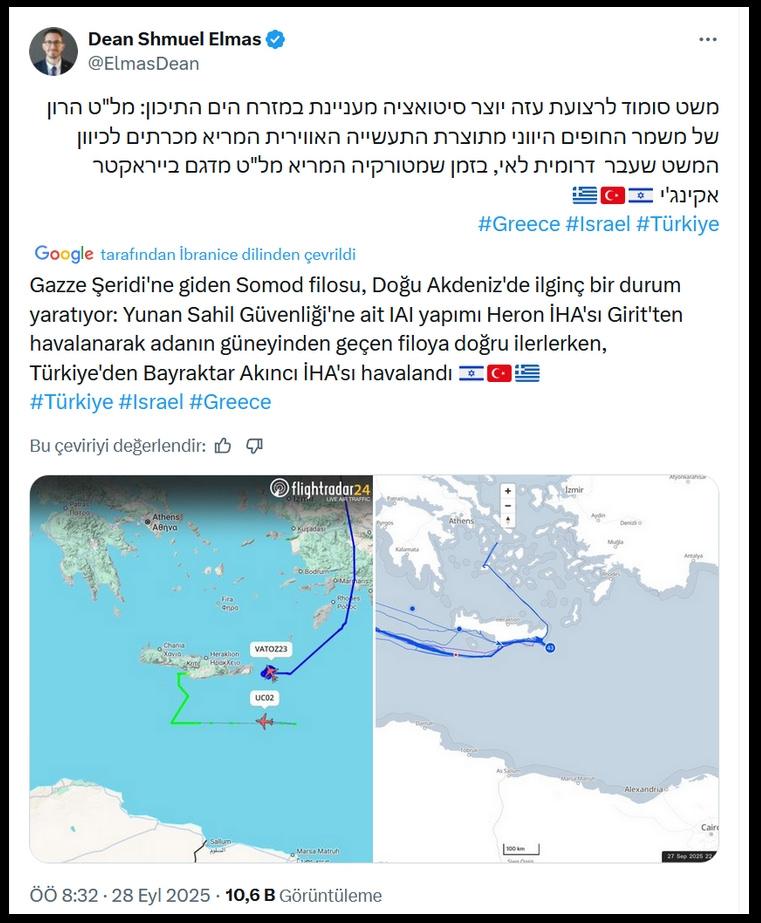 “Gazze Şeridi’ne giden Sumud filosu, Doğu Akdeniz’de farklı bir durum yaratıyor: Yunan Kıyı Güvenliği’ne ilişkin IAI imali Heron İHA’sı Girit’ten havalanarak adanın güneyinden geçen filoya hakikat ilerlerken, Türkiye’den Bayraktar Akıncı İHA’sı havalandı”