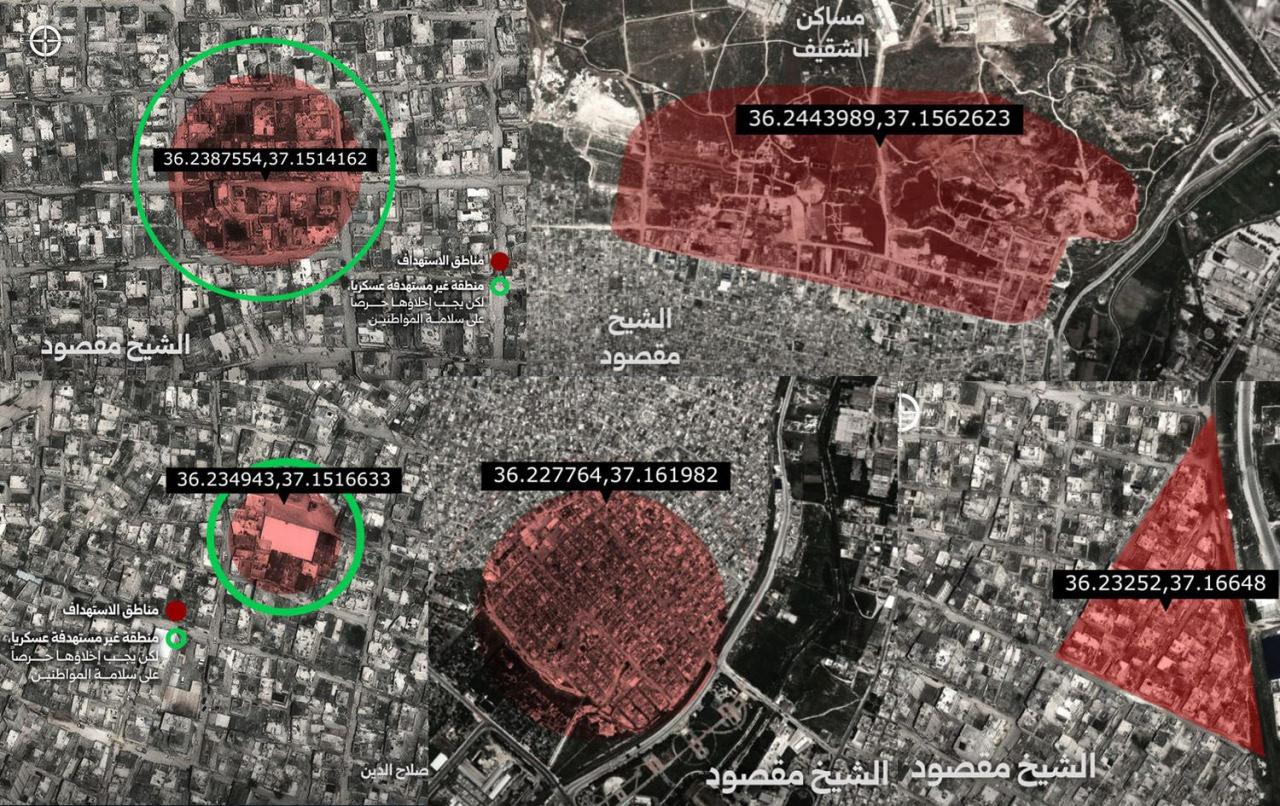 Şeyh Maksud ve Eşrefiye görsellerinde yüksek irtifa keşifle yoğun kentsel doku içindeki stratejik boşlukların ve binaların çatı yapılarının net halde tahlil edildiği görülüyor. Suriye ordusunun meskun mahal çatışmalarında ikincil hasarı (collateral damage) önlemek için binaların mimari ayrıntılarına hakim olduğu fark ediliyor.