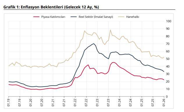 Buna nazaran; 2026 yılı Ocak ayında 12 ay sonrası yıllık enflasyon beklentileri bir evvelki aya nazaran piyasa iştirakçileri için 1,15 puan azalarak yüzde 22,20 düzeyine, gerçek kesim için 1,90 puan azalarak yüzde 32,90 düzeyine gerilerken; hanehalkı için 1,18 puan artarak yüzde 52,08 düzeyine yükseldi. Gelecek 12 aylık devirde enflasyonun düşeceğini bekleyen hanehalkı oranı bir evvelki aya nazaran 1,64 puan artarak yüzde 26,17 düzeyinde gerçekleşti.