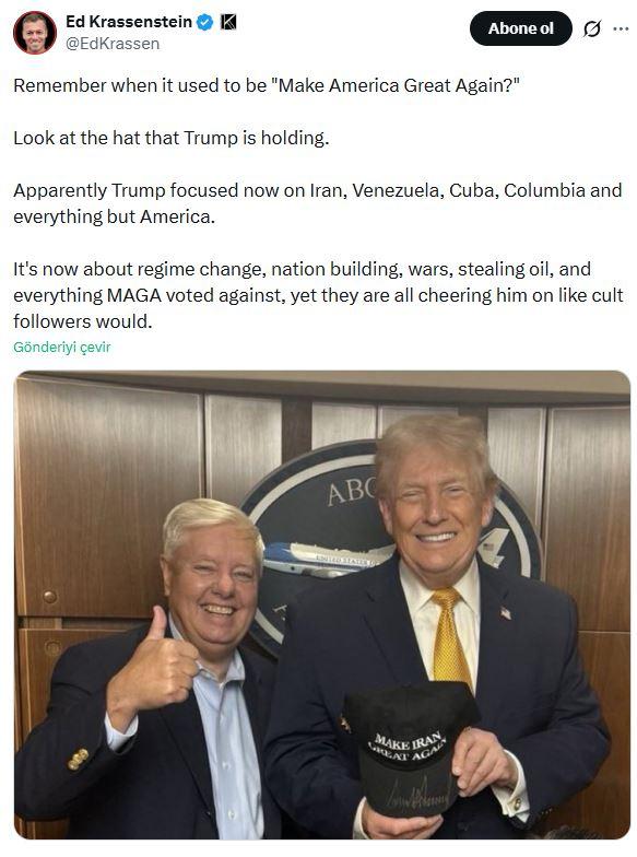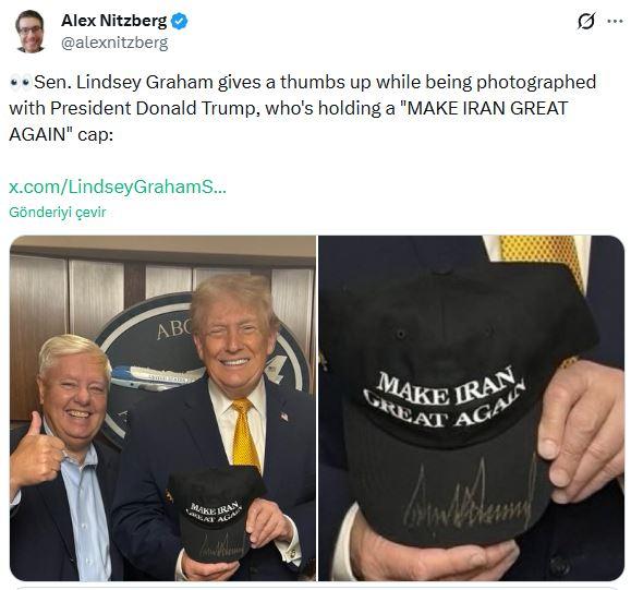 ABD siyasetinde “Make America Great Again” (Amerika’yı Tekrar Mükemmel Yap – MAGA) sloganıyla özdeşleşen Donald Trump, bu sefer objektiflere farklı bir bildiriyle yansıdı. ABD’li gazeteci Alex Nitzberg tarafından paylaşılan ve gündem olan fotoğrafta, Senatör Lindsey Graham başparmağıyla onay işareti yaparken, Trump’ın elinde kırmızı üzerine beyaz yazıyla “Make Iran Great Again” (İran’ı Tekrar Şahane Yap) yazılı bir şapka tuttuğu görüldü. Bu kare, Washington’daki dış siyaset tartışmalarını yine alevlendirdi.