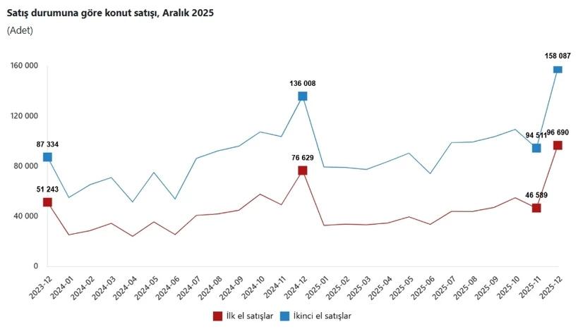 Türkiye genelinde birinci el konut satış sayısı Aralık ayında bir evvelki yılın birebir ayına nazaran yüzde 26,2 oranında artarak 96 bin 690 oldu. Birinci el konut satışları 2025 yılında bir evvelki yıla nazaran yüzde 11,6 oranında artarak 540 bin 786 olarak gerçekleşti. Toplam konut satışları içinde birinci el konut satışlarının hissesi aralık ayında yüzde 38,0, 2025 yılında yüzde 32,0 oldu.
