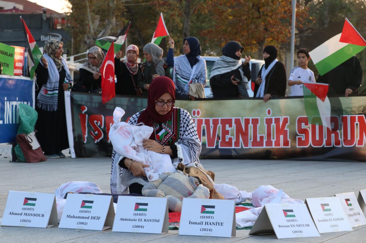 Ellerindeki Türk ve Filistin bayraklarıyla Gar Meydanı’nda toplanan dernek üyeleri ile vatandaşlar, İsrail’in Global Sumud Filosu’na düzenlediği akınları kınadı.