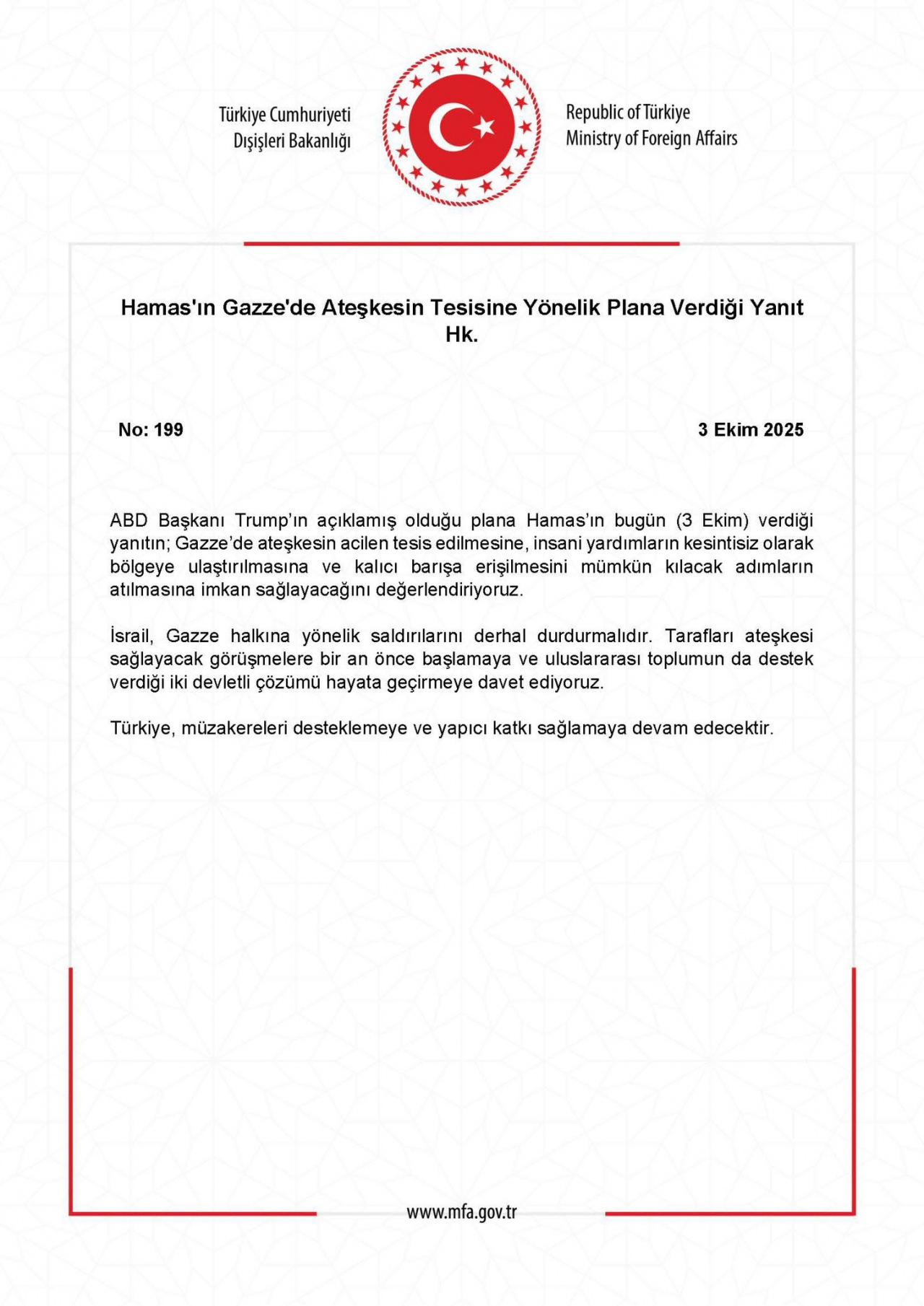 Bakanlıktan yapılan açıklamada, “ABD Başkanı Trump’ın açıklamış olduğu plana Hamas’ın bugün (3 Ekim) verdiği cevabın; Gazze’de ateşkesin hemen tesis edilmesine, insani yardımların kesintisiz olarak bölgeye ulaştırılmasına ve kalıcı barışa erişilmesini mümkün kılacak adımların atılmasına imkan sağlayacağını değerlendiriyoruz” denildi.