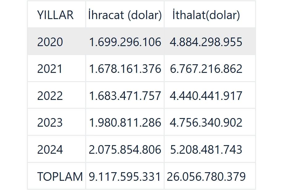 Gürcistan’a yönelik ihracattaki artış da dikkati çekti. Bu ülkeye yapılan ihracat 2020’de 29 milyon 685 bin dolarken, 2024’te 4 katına çıkarak 124 milyon 344 bin doları buldu.